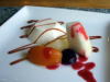 おなじみイタリアのデザート、パンナコッタです。ムチムチっとした食感がたまりません。キャラメルソースと合わせて、パワーアップした美味しさ!一緒に添えた果物は洋梨、巨峰、杏。どれも優しい甘さのコンポートです。 |