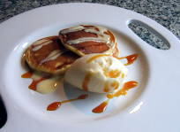 さつまいもそしてパンケーキ。どちらもお腹に優しくほっとするおやつの代表格です。裏ごししたさつまいもをパンケーキの材料に混ぜて焼くだけですが、アングレーズソースやキャラメルソース、それにアイスクリームを添えればちょっとした一皿です。 |