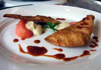 洋梨の季節です。洋梨といえばラ・フランスが有名ですがそれ以外にも数多くの種類があります。今回使ったのは、マルゲリットという少し酸味のある品種です。洋梨を煮た後に残ったワインのシロップをゼリーにしてトッピング。残らず頂きましょう。 |